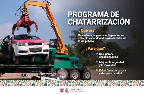 - El Gobierno de la Ciudad de México fortalece la recuperación del espacio público mediante el Programa de Chatarrización, retirando vehículos abandonados de la vía pública para mejorar la seguridad, la movilidad y el entorno urbano.