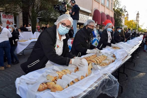 En esta edición, la rosca gigante alcanzará una longitud de 2 mil 200 metros, superando la del año anterior, lo que refleja el esfuerzo y compromiso de los panaderos locales por mantener viva esta festividad. En su elaboración participan más de 100 panaderos y cinco reconocidas panaderías del estado, quienes trabajan de manera coordinada para garantizar un producto de alta calidad, elaborado con ingredientes seleccionados y bajo estrictos estándares de higiene.