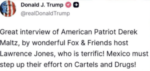 “¡México debe intensificar sus esfuerzos contra los cárteles y las drogas!”, escribió Trump en una publicación en Truth Social.