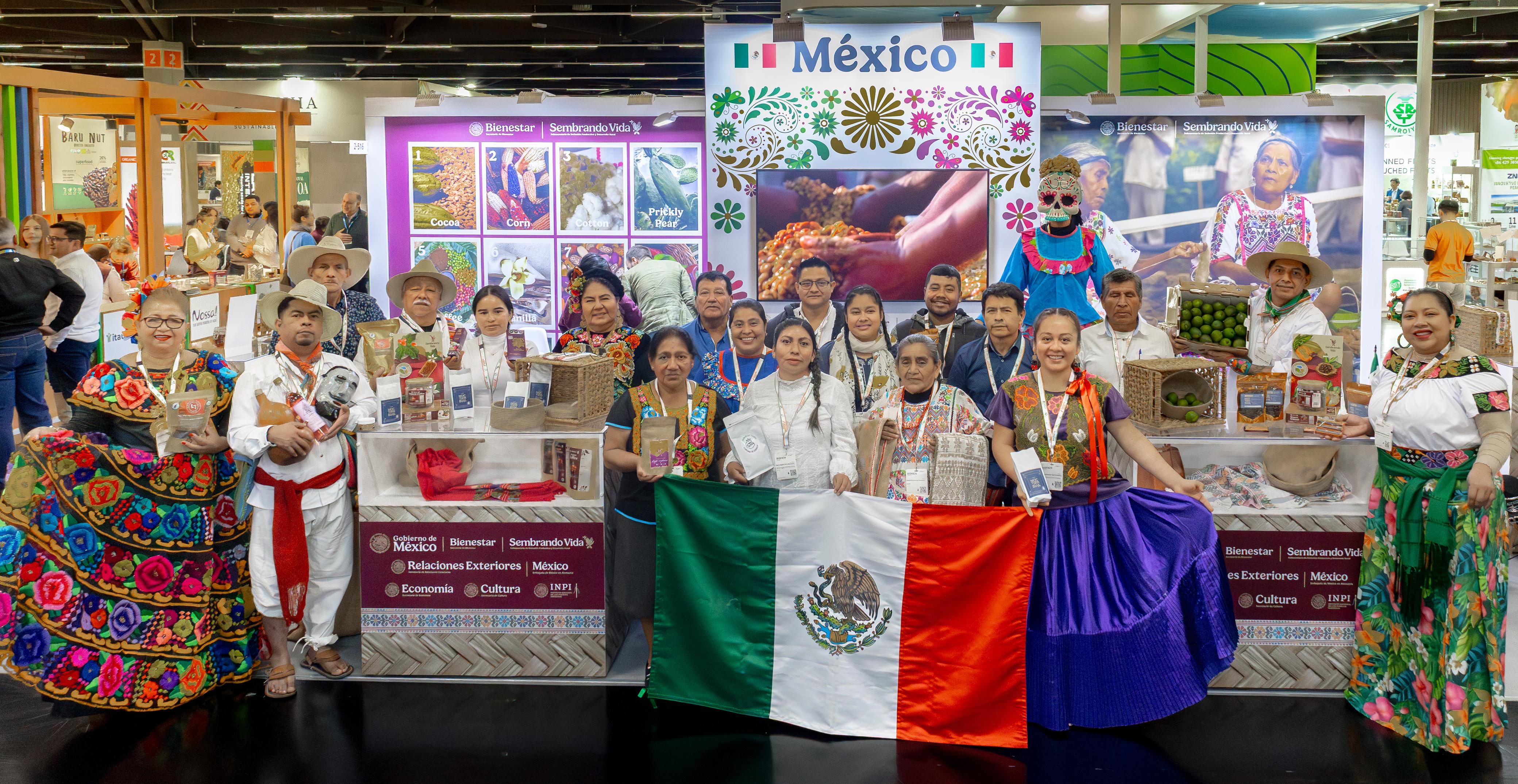 México está representado por sembradoras y sembradores provenientes de Chiapas, Chihuahua, Guerrero, Oaxaca, Tabasco y Veracruz, que presentaron café, cacao y limón persa orgánico, cultivados bajo prácticas agroecológicas que priorizan el cuidado del territorio y la producción sustentable que impulsa Sembrando Vida.