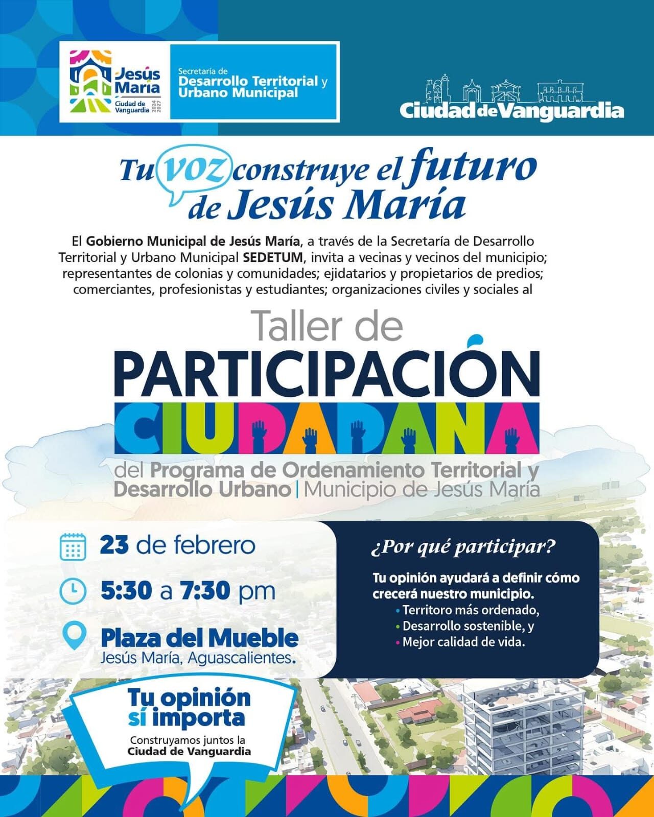 De esta manera, el Gobierno Municipal de Jesús María promueve la participación activa de la población para definir el crecimiento del municipio en los próximos años, con una visión de futuro y mejores condiciones para todas y todos.