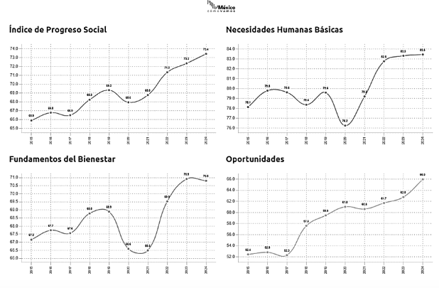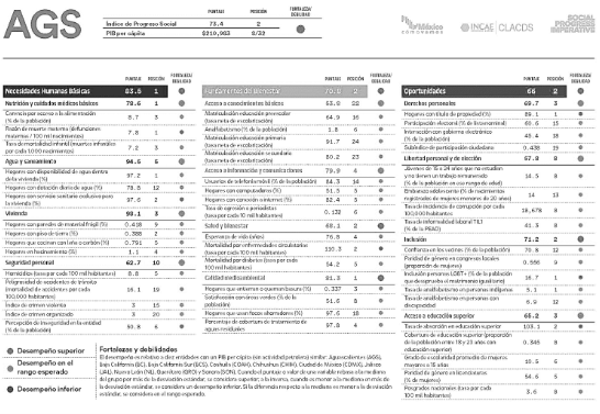 Índice de Progreso Social (IPS): Aguascalientes se posicionó en 2024 y 2025 como el 2º lugar a nivel nacional en progreso social, con 73.7 puntos, solo por debajo de la Ciudad de México. Dimensiones del índice de Progreso Social: