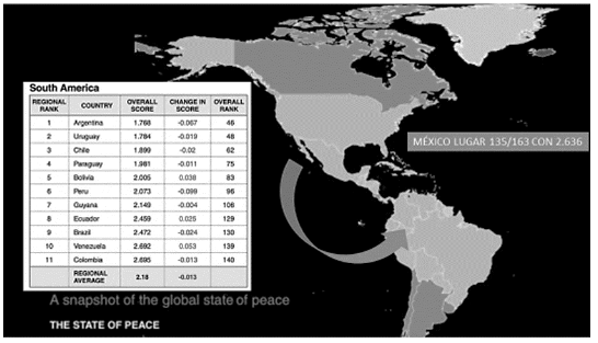 Los 5 países menos pacíficos son: Rusia 3.441; Ucrania 3.434; Sudán 3.323; Rep. Democrática del Congo 2.92; Yemen 3.262 y Afganistán 3.229. México cuenta con un tercio del país con las mismas o mayores puntuaciones entre los estados de Tabasco, Sinaloa, Sonora, Guerrero, de México, Nuevo León, Chihuahua, Quintana Roo, BC, Morelos, Guanajuato y Colima; los cuatro últimos superan a todos los países clasificados por presentar 4 puntos o más.