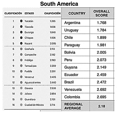 México sería décimo en IPG entre los países de América Latina; pero entre sus estados tenemos que Yucatán supera a todos los países de América Latina con solo 1.265 puntos; Aguascalientes cuenta con un IPG de 2.44 semejante al de Brasil; Querétaro y Jalisco, se ubican en forma semejante a Colombia y Venezuela con 2.7. Latinoamérica obtiene una calificación promedio de 2.18 cercana a la del estado de Hidalgo en México con 2.19.