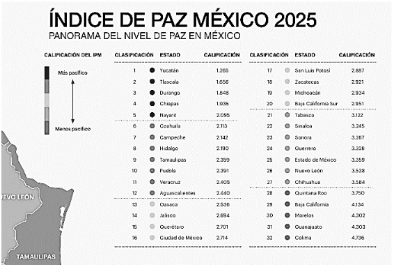 México ocupa el puesto 135 entre 163 países evaluados por el Índice de Paz Global 2025, con una puntuación de 2.636. El país sigue siendo considerado uno de los más violentos a nivel internacional, con altos niveles de violencia y desafíos en seguridad pública. (cfr. indicedepazmexico.org)
