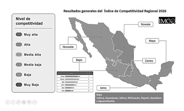 En competitividad regional Aguascalientes forma parte de la Región del Bajío calificada en el 2026 por el IMCO como de competitividad “media alta”, teniendo en “verde” o de competitividad alta al Noreste y de “media alta” al Noroeste. La zona Centro y la Región Maya presentan un nivel “Medio bajo” y “baja” la del Istmo.