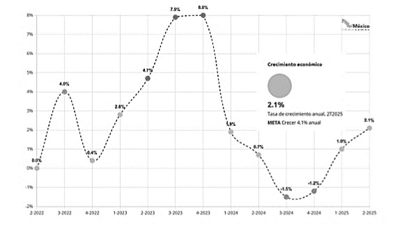 Comportamiento trimestral del Semáforo Económico de Aguascalientes. Crecimiento Económico: En el segundo trimestre de 2025, el PIB creció 2.1% anual, lo que mantiene el semáforo de crecimiento en naranja debido al bajo desempeño.