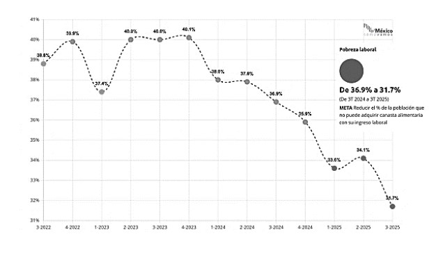 Pobreza Laboral: Para el tercer trimestre de 2025, la tasa se redujo a 31.7% por ello se representa en verde por haber logrado un descenso en el porcentaje de personas que no pueden adquirir la canasta básica con sus ingresos laborales.