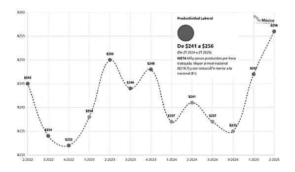 Productividad laboral: La productividad laboral aumentó a $256 pesos por hora trabajada al segundo trimestre de 2025.