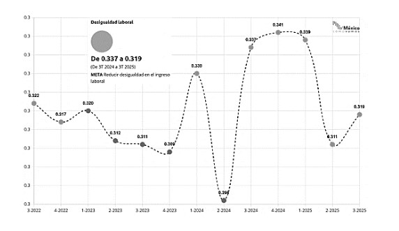 Desigualdad Laboral: Al tercer trimestre del 2025 el índice de Gini, o de concentración del ingreso, se ubicó en 0.319 cuando lo deseable es estar debajo de los 300 puntos como se logró en el 2° trimestre del 2024.
