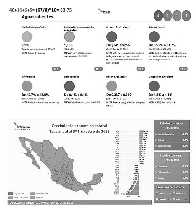 Haciendo una valoración de los Semáforos Económicos de México, ¿cómo vamos?, tenemos al país con una calificación de 65.6, muy cercana a su Índice de Progreso Social (IPS) de 65.8, lo que lo posicionó en el lugar 69 a nivel mundial. La Ciudad de México, Aguascalientes, Baja California Sur, Querétaro y Nuevo León fueron las cinco entidades con el mejor desempeño en el IPS. Aguascalientes destacó como uno de los estados con mayor progreso social, con un puntaje de 73.7.