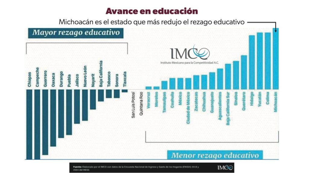 Michoacán logró colocarse como la entidad del país que más avanzó en la reducción del rezago educativo, de acuerdo con un análisis del Instituto Mexicano para la Competitividad (Imco), que ubica al estado como el primero a nivel nacional en la mejora de este indicador clave para el desarrollo social.